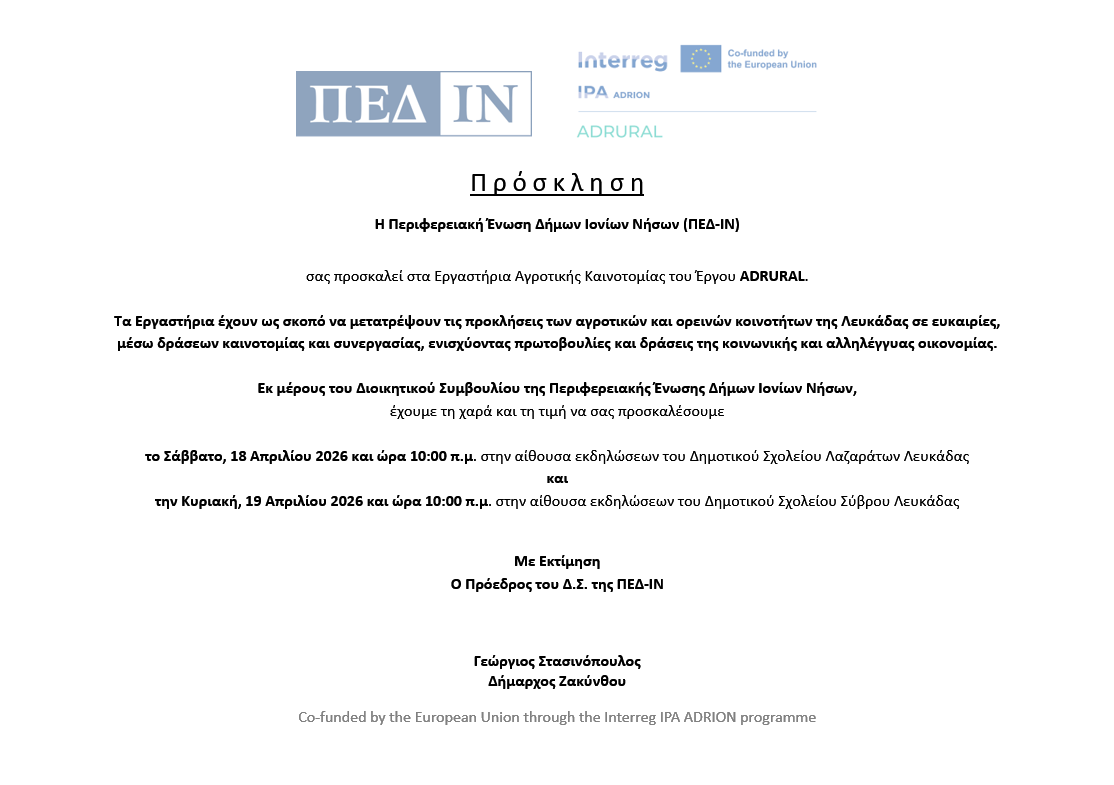 Εκ μέρους του Διοικητικού Συμβουλίου της Περιφερειακής Ένωσης Δήμων Ιονίων Νήσων, έχουμε τη χαρά και τη τιμή να σας προσκαλέσουμε το Σάββατο, 18 Απριλίου 2026 και ώρα 10:00 π.μ. στην αίθουσα εκδηλώσεων του Δημοτικού Σχολείου Λαζαράτων Λευκάδας και την Κυριακή, 19 Απριλίου 2026 και ώρα 10:00 π.μ. στην αίθουσα εκδηλώσεων του Δημοτικού Σχολείου Σύβρου Λευκάδας.