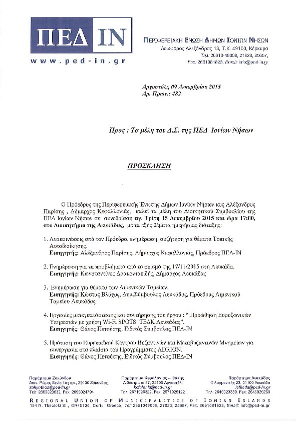 Πρόσκληση Συνεδρίασης Διοικητικού Συμβουλίου, 15/12/2015 Λευκάδα Δελτία Τύπου / 09.12.2015 Δελτία Τύπου